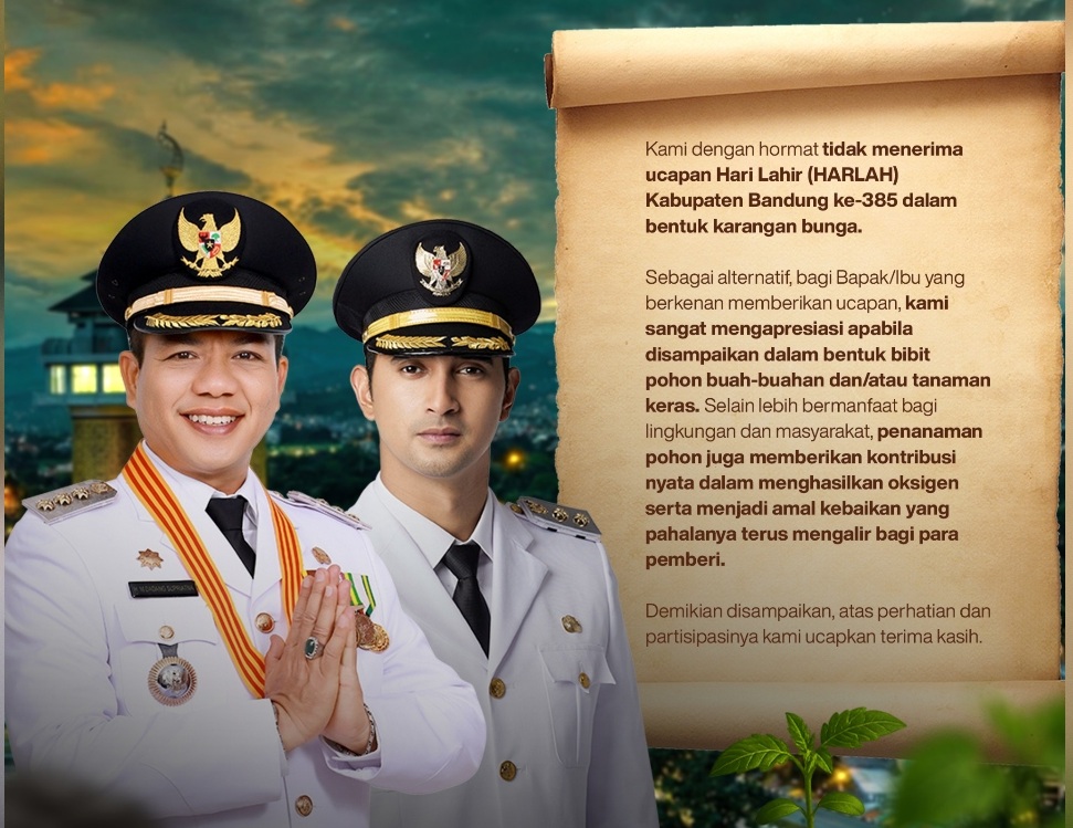 “Setelah kemarin kita putuskan untuk mengalihkan anggaran Hari Jadi Kabupaten Bandung ke-385 untuk penanganan bencana banjir, dengan hormat kami pun tidak menerima ucapan Selamat Jadi Kabupaten Bandung dalam bentuk karangan bunga,” imbuh KDS.