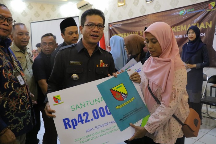 Penyerahan santunan sebesar Rp42 juta per ahli waris dari BPJS Ketenegakerjaan itu dilaksanakan di Sekretariat KPU Kabupaten Bandung, Jl Sindangwangi Kecamatan Soreang, Selasa (20/2/2024).