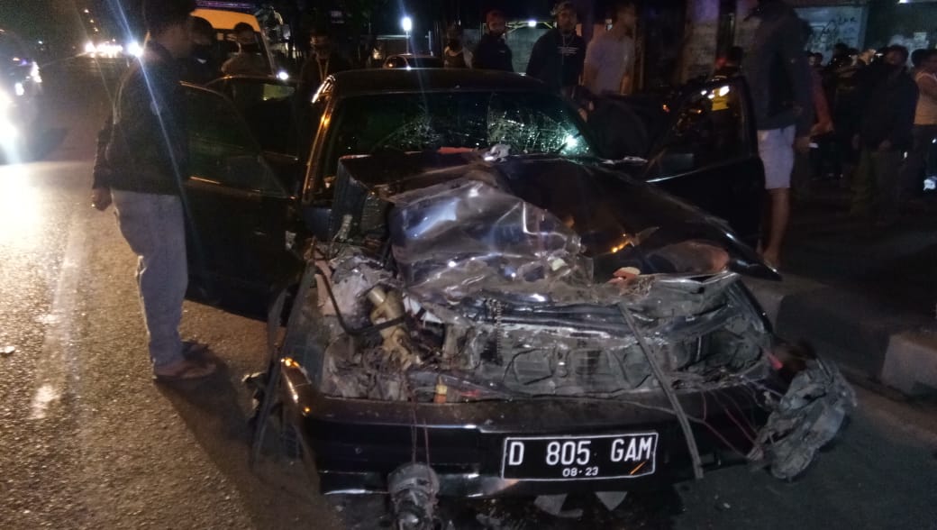 Mobil sedan berplat nomor D 805 GAM yang ditumpangi empat warga yang membawa narkoba dan pistol rusak usai mengalami kecelakaan tunggal.