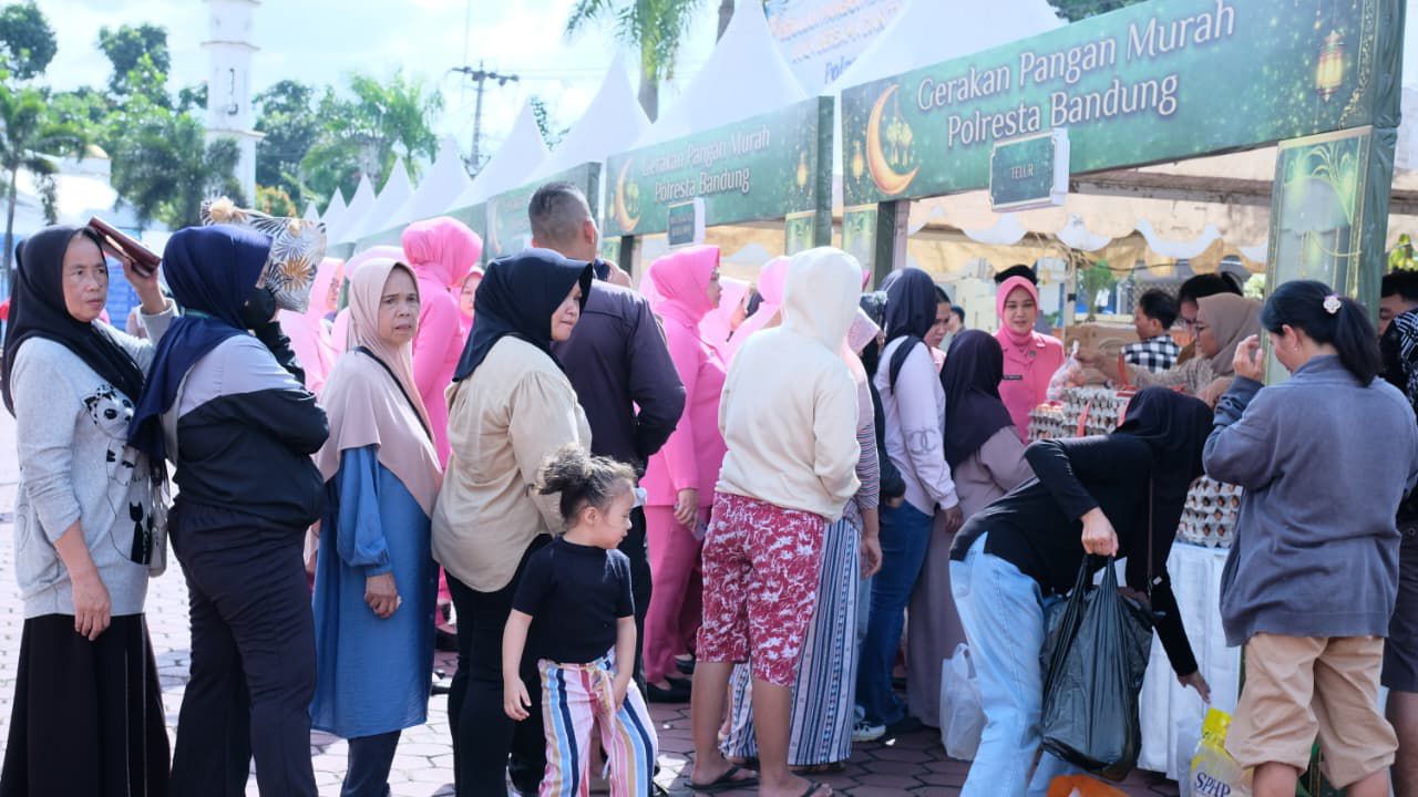 SOREANG, balebandung.com – Polresta Bandung menggelar Gerakan Pangan Murah Ramadan 1447 H/2026 M di Lapangan Apel Mapolresta Bandung, Rabu (11/3/2026). Kegiatan tersebut disambut antusias masyarakat karena menyediakan berbagai kebutuhan pokok dengan harga lebih terjangkau.