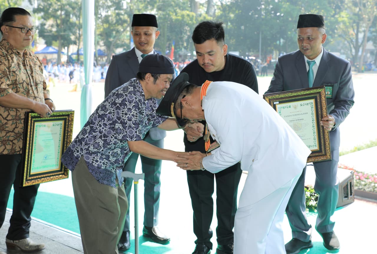 Bupati Bandung Dadang Supriatna memberikan penghargaan kepada Yayat Suwarsa Wanurtabah, Penelaah Teknis Kebijakan Subbagian Program dan Keuangan Kecamatan Ibun, yang dianugerahi sebagai Maestro Borondong Ketan Ibun. Penghargaan diberikan seusai upacara peringatan Hari Jadi e-385 Kab Bandung di Lapang Upakarti Soreang, Senin (20/4/26).