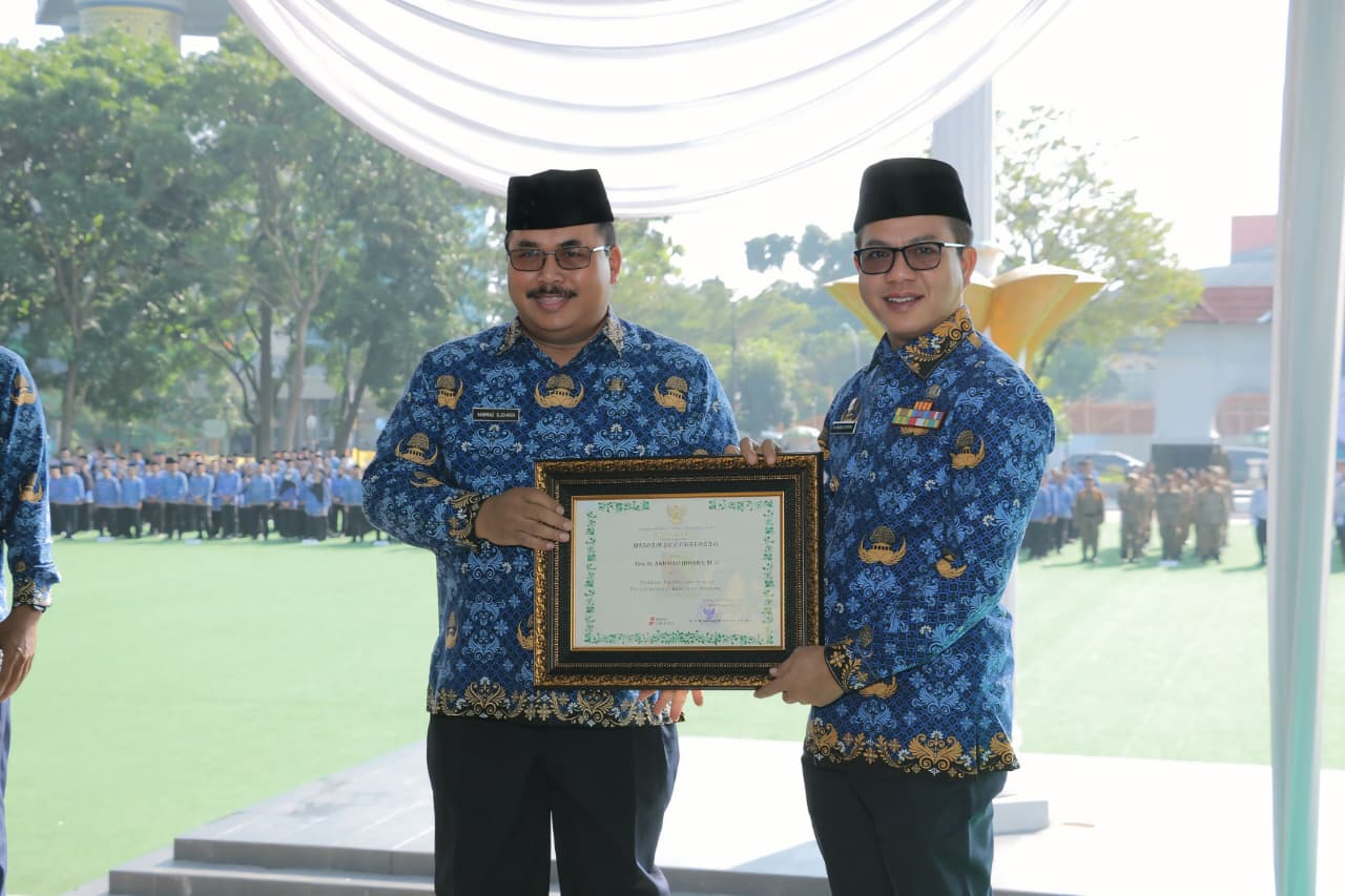 Bupati Bandung Dadang Supriatna memberi penghargaan kepada Kadispora Kab Bandung Ahmad Djohara saat peringatan Haornas, Senin (21/9/25). (Foto: Iwa/Ketik)