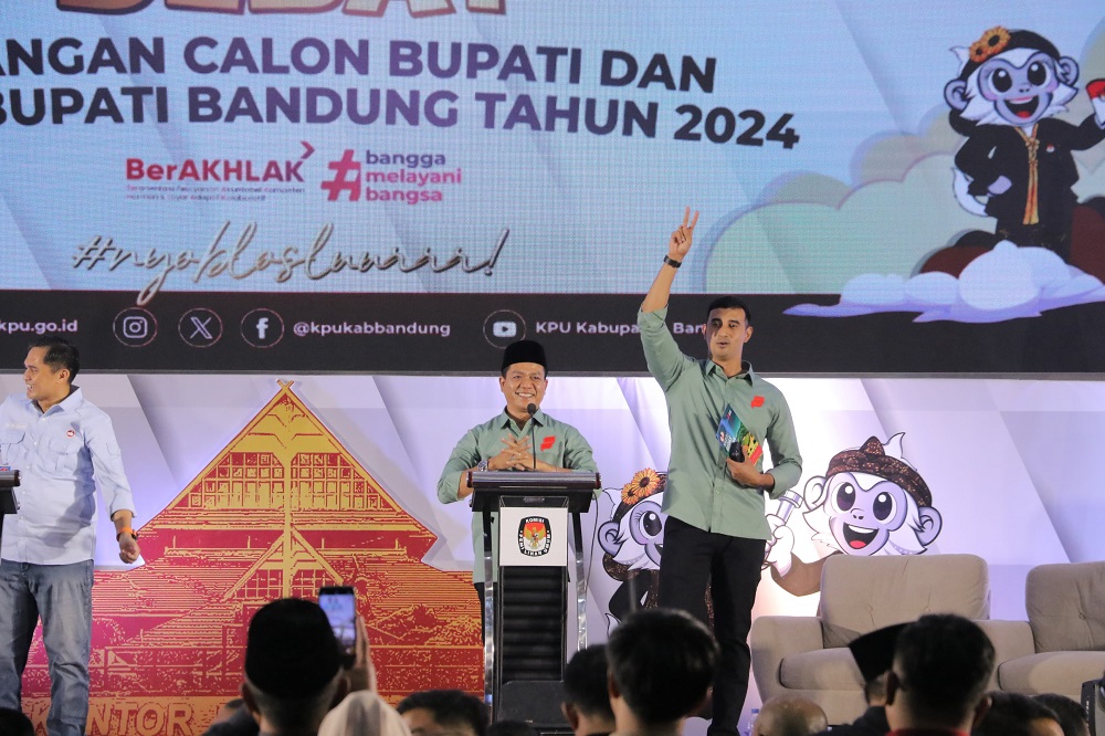 Paslon Cabup/Cawabup Bandung nomor urut 2, Dadang Supriatna-Ali Syakieb seusai debat publik perdana KPU Kab Bandung di Sutan Raja Soreang, Rabu (30/10/24) malam.