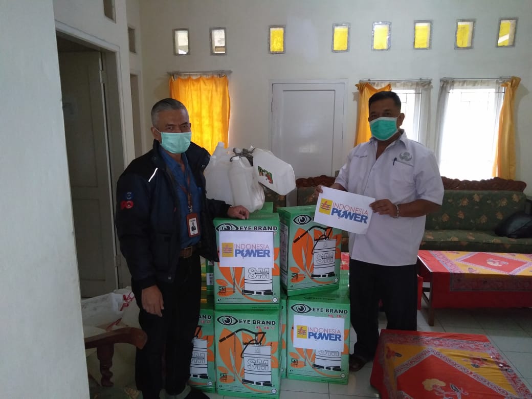 Perwakilan manajemen PT Indonesia Power Area Kamojang Yunara (kiri), menyerahkan bantuan kepada Camat Ibun, di depan Kantor Kec Ibun, Kab Bandung, Kamis (15/4/20). by Humas IP