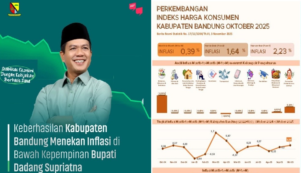 Berdasarkan rilis BPS Kabupaten Bandung mengenai perkembangan Indeks Harga Konsumen (IHK) Oktober 2025 (disampaikan pada 3 November 2025), inflasi Kabupaten Bandung tercatat berada pada angka 0,39 persen. Angka ini menunjukkan bahwa pergerakan harga masih terkendali, serta daya beli masyarakat tetap terjaga.