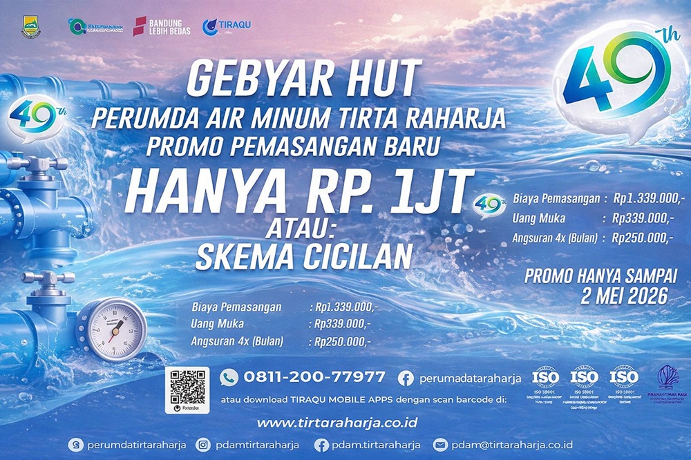 Program promo sambungan baru ini berlaku hingga 2 Mei 2026 dan dapat dimanfaatkan oleh masyarakat di wilayah pelayanan Perumda Air Minum Tirta Raharja. Informasi lebih lanjut dapat diperoleh melalui layanan pelanggan maupun kanal resmi Perumda Air Minum Tirta Raharja.***