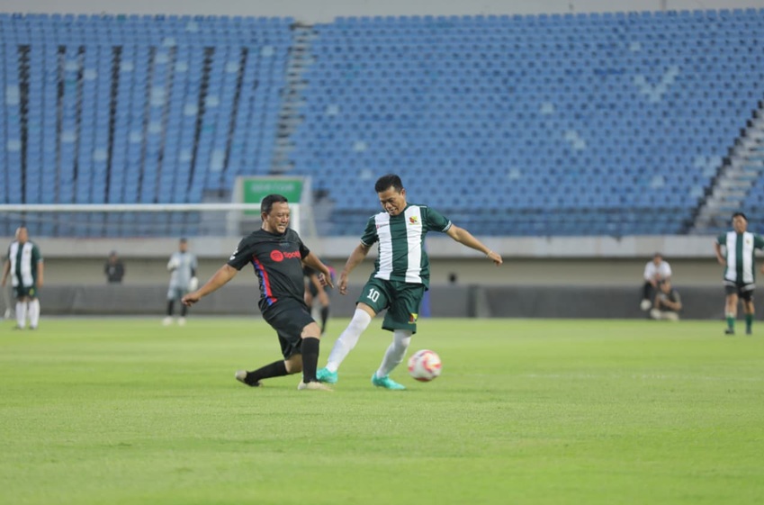Bupati Bandung Dadang Supriatna bermain sepakbola saat pembukaan POR DPRD di Stadion Si Jalak Harupat Kab Bandung, Selasa (27/1/26)