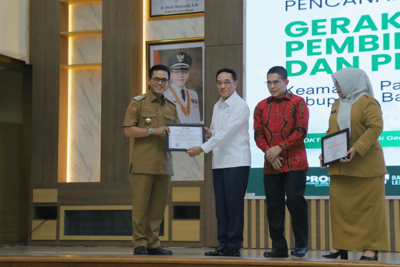 Penghargaan diserahkan Wakil Menteri Kesehatan Benjamin Paulus kepada Ketum Akkopsi Dadang Supriatna di sela kegiatan Deklarasi Aksi Nyata Laik Higiene Sanitasi (LHS) pada Satuan Pelayanan Pemenuhan Gizi (SPPG) dalam Program Makan Bergizi Gratis (MBG) Sehat, Aman dan Berkelanjutan, di Gedung M Toha Soreang, Selasa 21 Oktober 2025.
