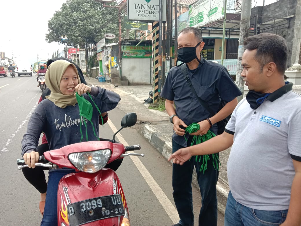 JATINANGOR, Balebandung.com – Sejumlah pengendara dan warga di Jalan Raya Ir. Soekarno Kecamatan Jatinangor Kabupaten Sumeang mendapatkan masker gratis dari Forum Komunikasi Wartawan Sumedang (Forkowas), Kamis (2 /4/20).