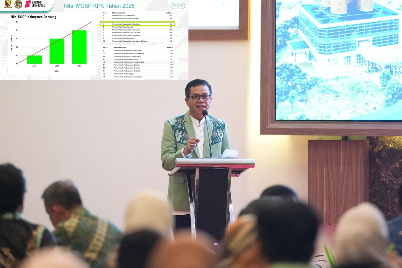 SOREANG, balebandung.com – Kabupaten Bandung merebut peringkat tertinggi se-Jawa Barat, dalam penilaian Monitoring, Controlling, and Surveillance for Prevention (MCSP) atau Sistem Penilaian Integritas (SPI) dari KPK RI tahun 2025 dengan nilai 94%.