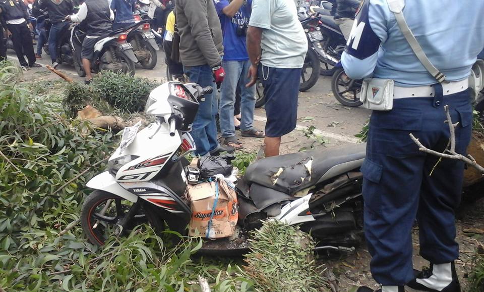 bb-pohon-tumbang-lanudMARGAHAYU, Balebandung.com – Sebuah pohon tumbang menimpa 3 pengendara motor di mana 1 tewas dan 2 pengendara motor lainnya seorang ibu dan anaknya luka kritis mengalami patah tulang. Belum diketahui identitas korban namun korban tewas yang tertimpa dahan pohon besar pada bagian punggungnya itu mengendarai motor Mio GT bernopol D 4023 ZBJ dengan ciri seorang pria berkaos warna merah dan celana panjang warna abu-abu.