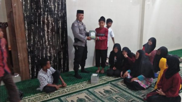 Saat itu, Bripka Kokon Nurjaman menyerahkan bantuan Al-Quran dan Iqra kepada santriawan/santriawati di Masjid Al Muhajirin tersebut.