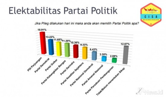 “Kemudian disusul oleh Partai Demokrat di urutan kedua yang melejit di 18,83 persen serta posisi ketiga ada Partai Golkar yang mendapatkan 13,09 persen,” sebut Direktur Eksekutif Centre for Indonesia Strategic Actions (CISA), Herry Mendrofa.