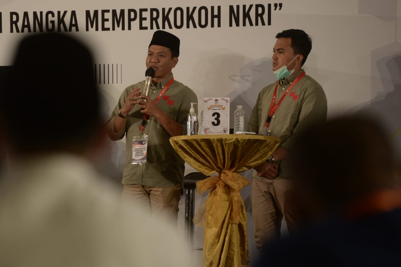 MARGAHAYU, Balebandung.com – Liaison officer (LO) Pasangan Calon Bupati dan Wakil Bupati Bandung Nomor 3 (Dadang Supriatna-Sahrul Gunawan), Hadiat, memprotes KPU Kabupaten Bandung, usai Debat Publik kedua, di Aula Kopo Square, Kecamatan Margahayu, Kabupaten Bandung, Sabtu (14/11/20) malam.