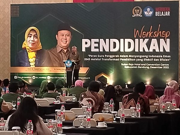 SOREANG,balebandung.com – Para Kepala Sekolah Menengah Pendidikan (SMP) Negeri maupun Swasta di Kabupaten Bandung mengikuti workshop pendidikan di Hotel Sutan Raja Soreang, Kamis (22/12/2022). Pelaksanaan workshop pendidikan itu dengan tema “Peran guru penggerak dalam menyongsong Indonesia Emas 2045, melalui pendidikan yang efektif dan efisien”.